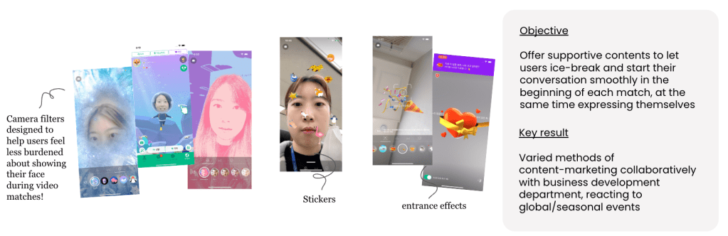 As a product manager leading the TF consisted of three graphic designers, one AR engineer, and Client side engineers, I have created an interface for adding stickers and effects in a user’s video background.